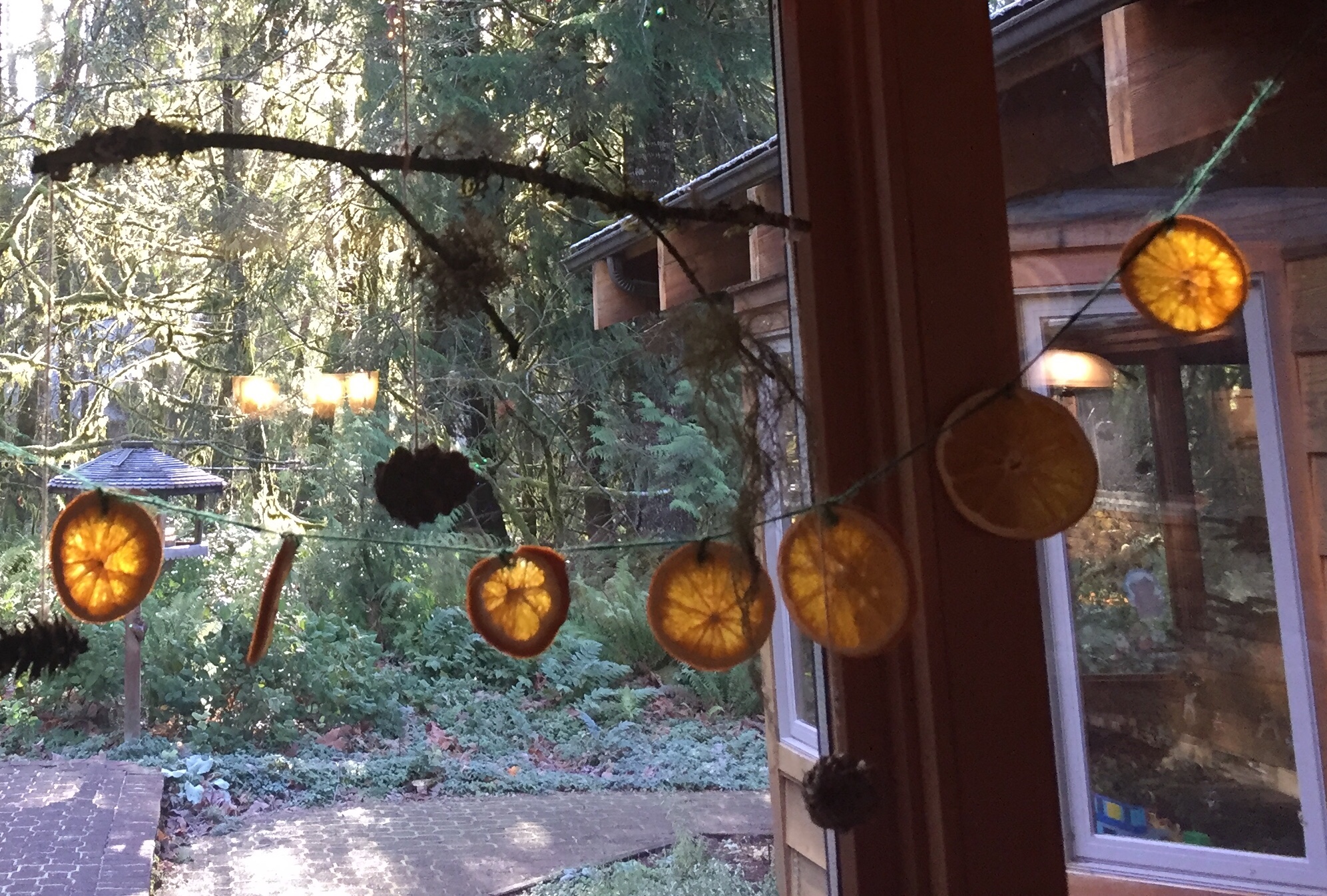 Hand craft ornaments, draw, write, make a wreath or garland yourself, hand-dip or roll sheets of beeswax candles, paint, sing, dance, or decorate cookies. A favorite activity of mine is making “Solstice Suns” by dehydrating slices of oranges and stringing them in front of windows around my house. The way the light shines through them is beautiful, plus they smell lovely.